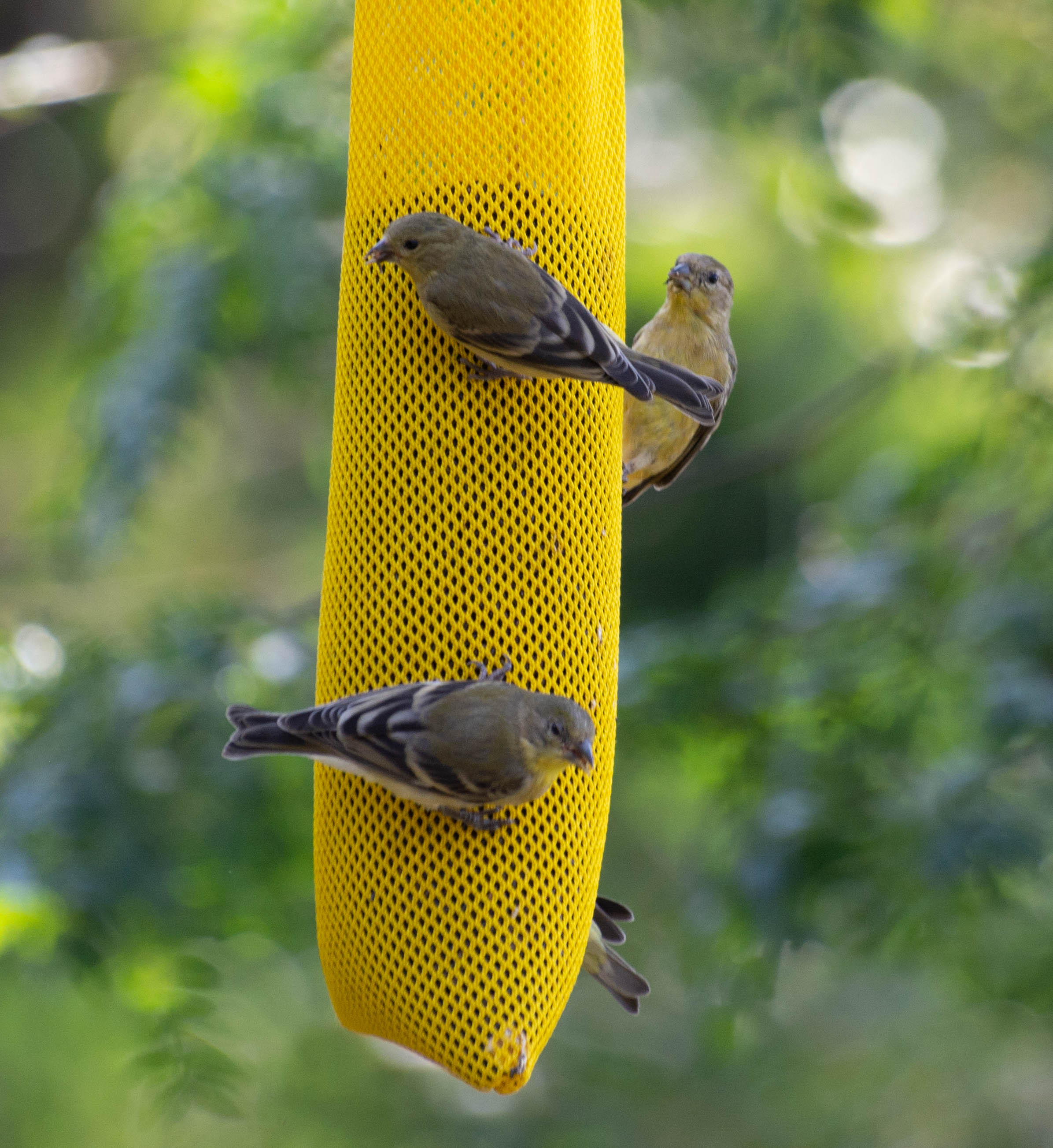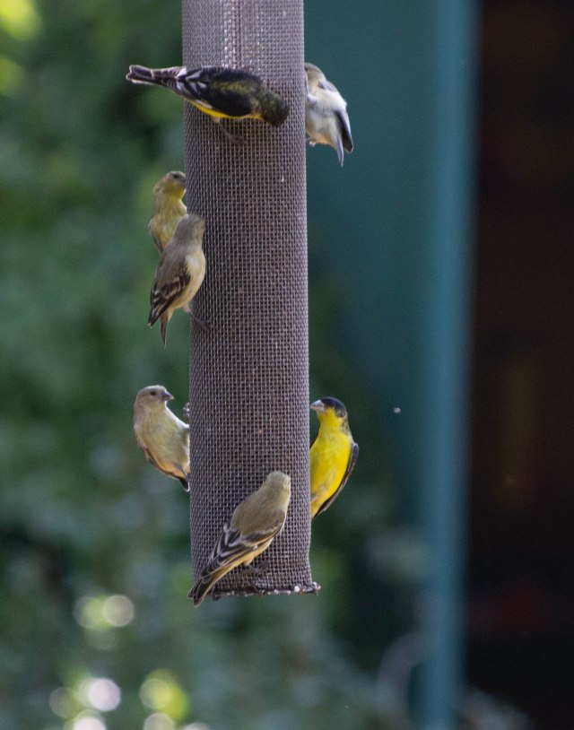 He took some bird pictures, with the “big camera”, but he said the lens didn’t have vibration reduction and so the camera should have been on a tripod, which it wasn’t. We have a lot of goldfinches, and there’s a lot of eating.