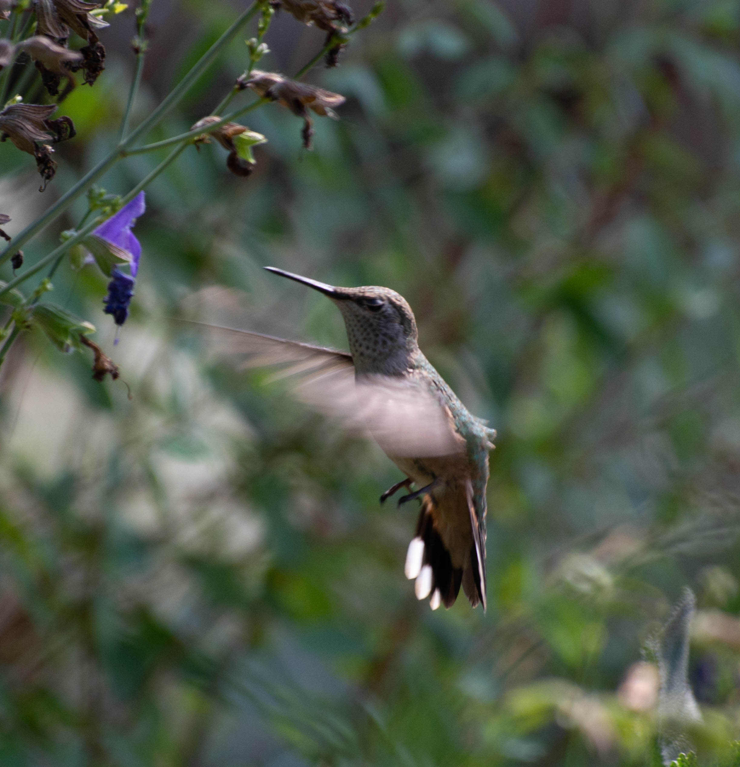 He looked up how to increase the shutter speed on the camera, and walked out into the garden with a red bandana tucked into his shirt, but all the hummingbirds disappeared.