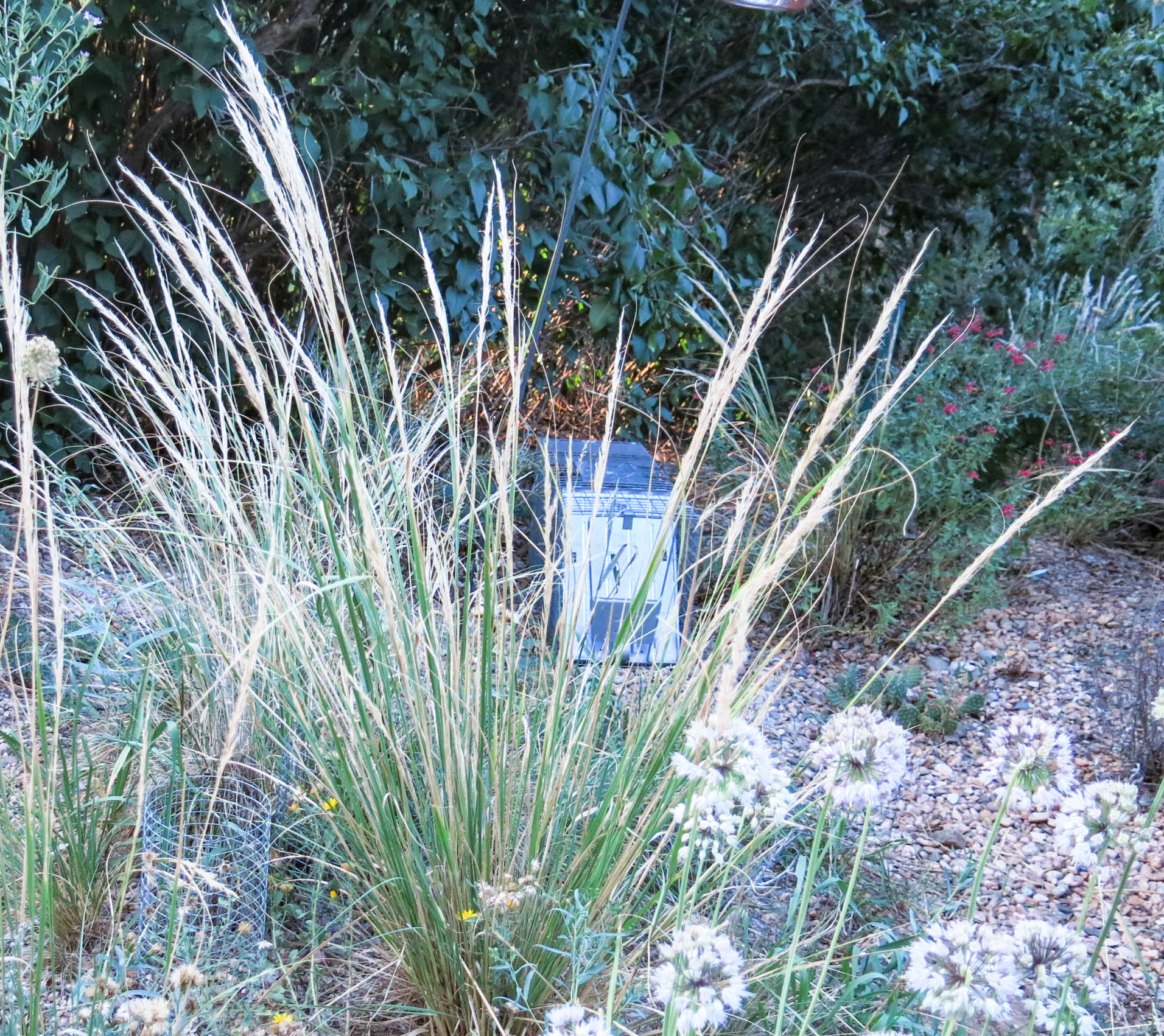 He says grasses are supposed to make you calm, which is one reason why there are a lot of them here. I’m only going to show this one, because it’s a little different. Achnatherum scribneri. It used to be called Stipa scribneri. Native to the Rocky Mountain region and I guess “points west”.