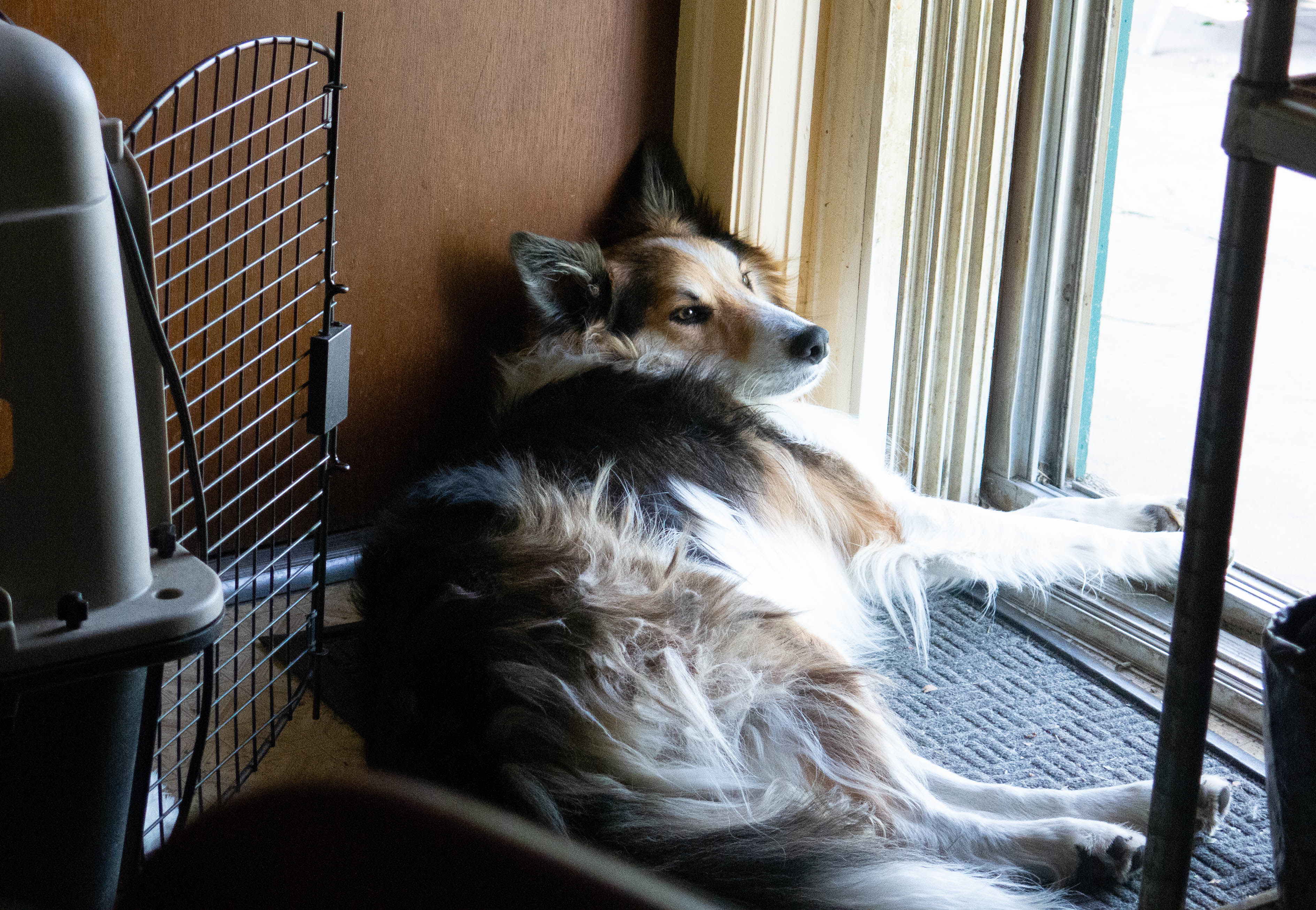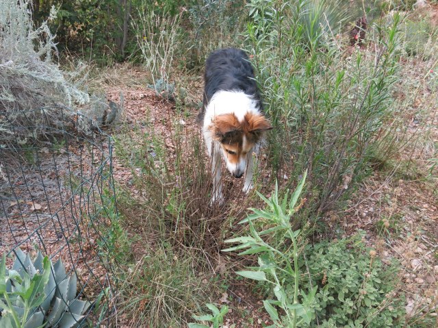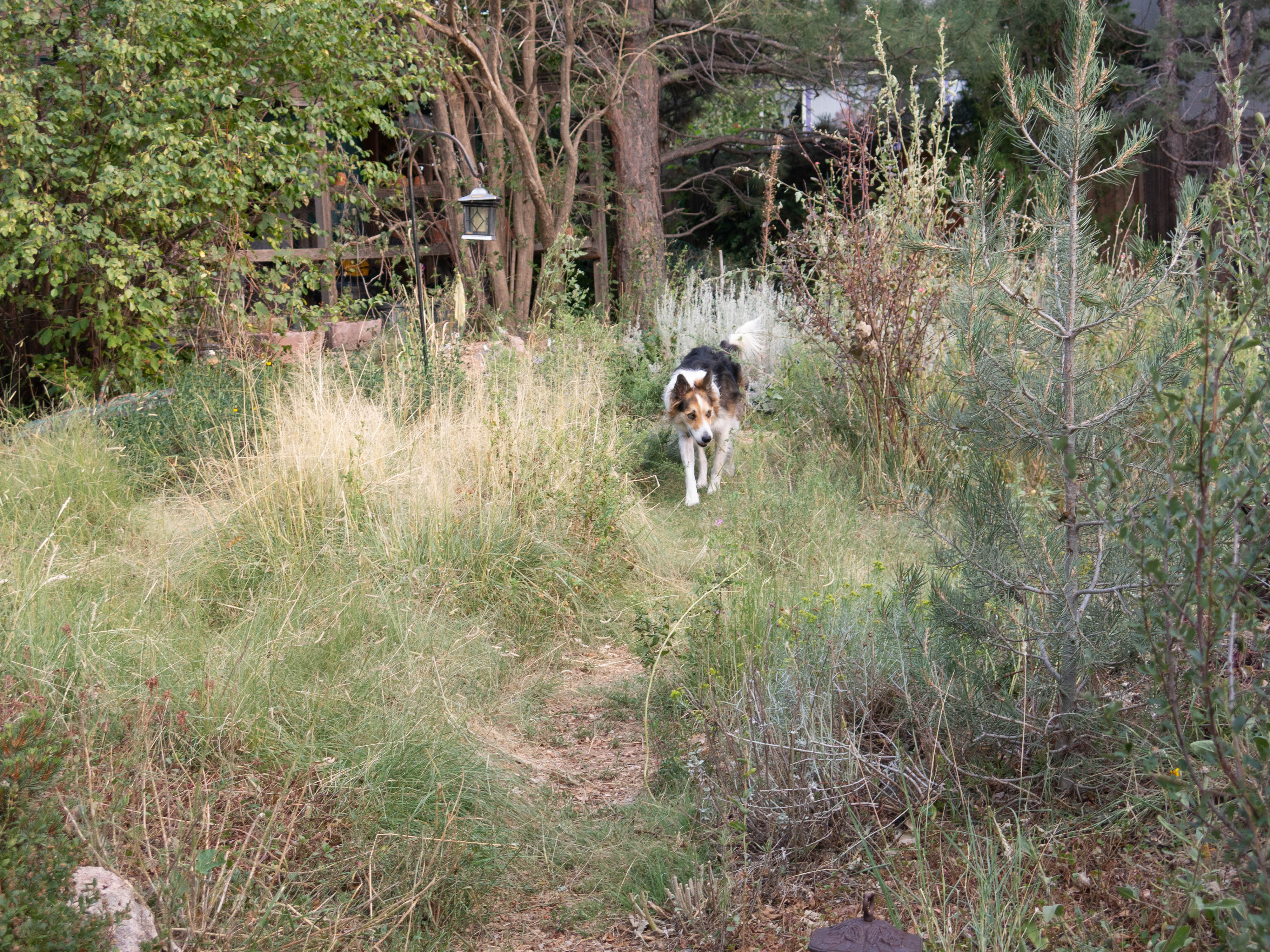 Mani, Mani, Mani, border-collie up. Accept the groom session. I groom Shredder the Maltese – thick curly coat – and Petey the terrier – nice silky hair but gnarled up by rolling around and playing at dog park – each evening. Shredder is stoic, which you should be. Petey is lost in ecstasy, like I am when I get a massage. Of course, if the guy you live with does the groom on a *regular basis* the job goes easier. Do you know, you look absolutely adorable when you suss out snakes, but Don’t Do It, even stripey-tail ones. I sense an amount of push/pull between you and the guy you live with, I really do. Your garden continues to look well, even with dead trees. We’ve got one too, we just noticed, so out it comes. No problem making that decision. Honestly, I went back up and reread the post, and I feel you should be given lots of credit for so nicely living with the guy. You might inform him lectures don’t do anything. Good luck with the smoke and the hose.