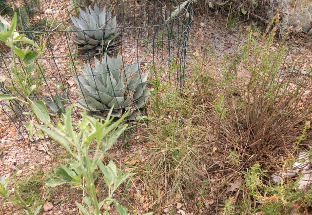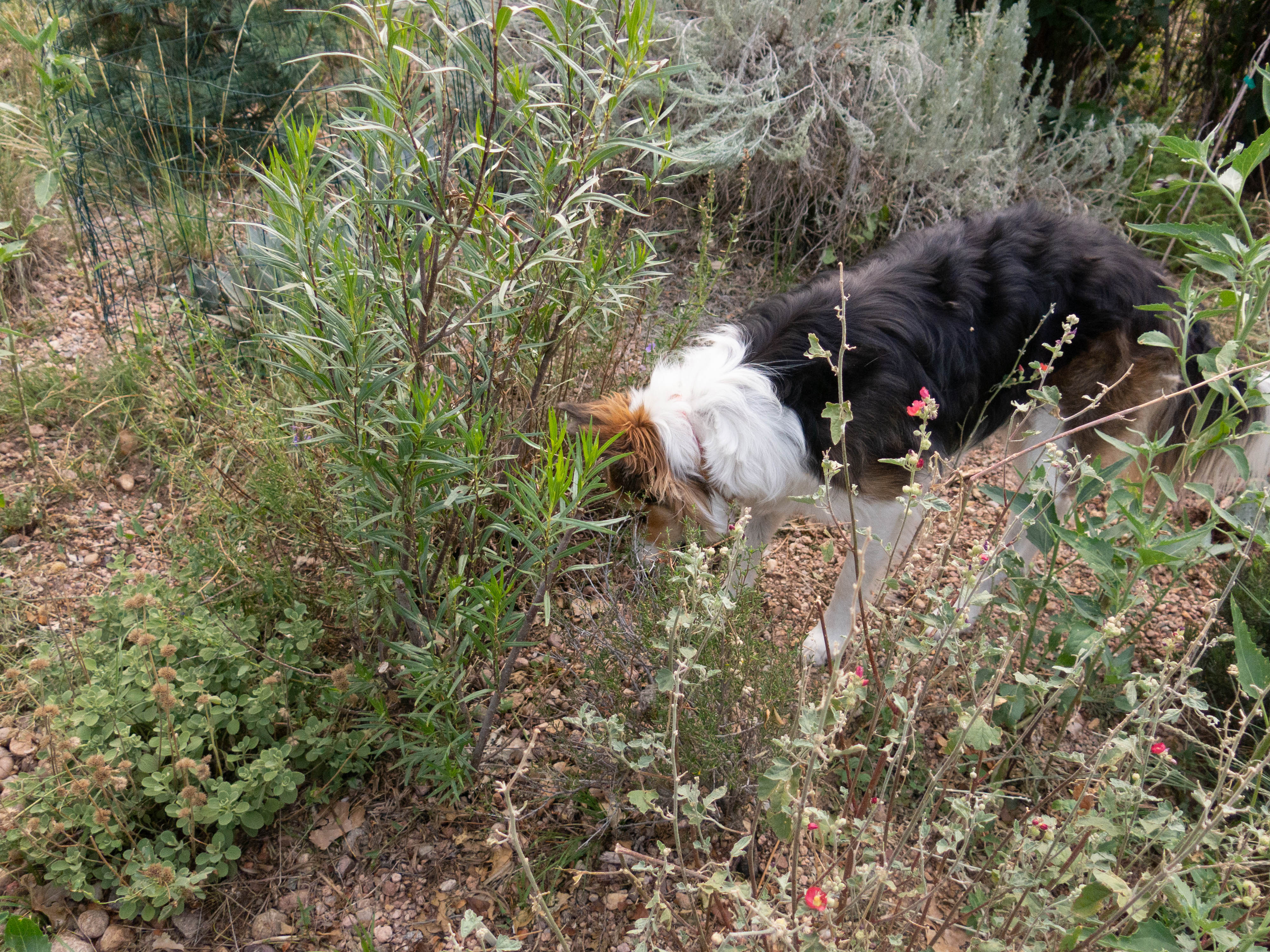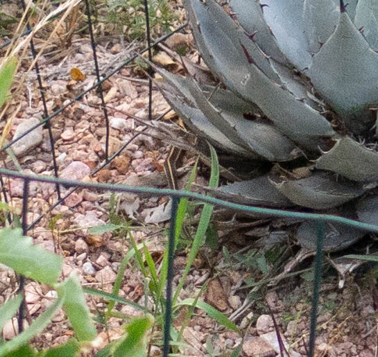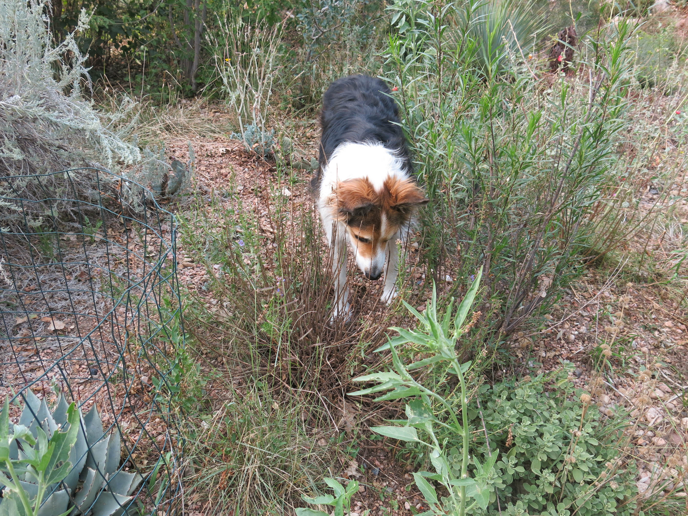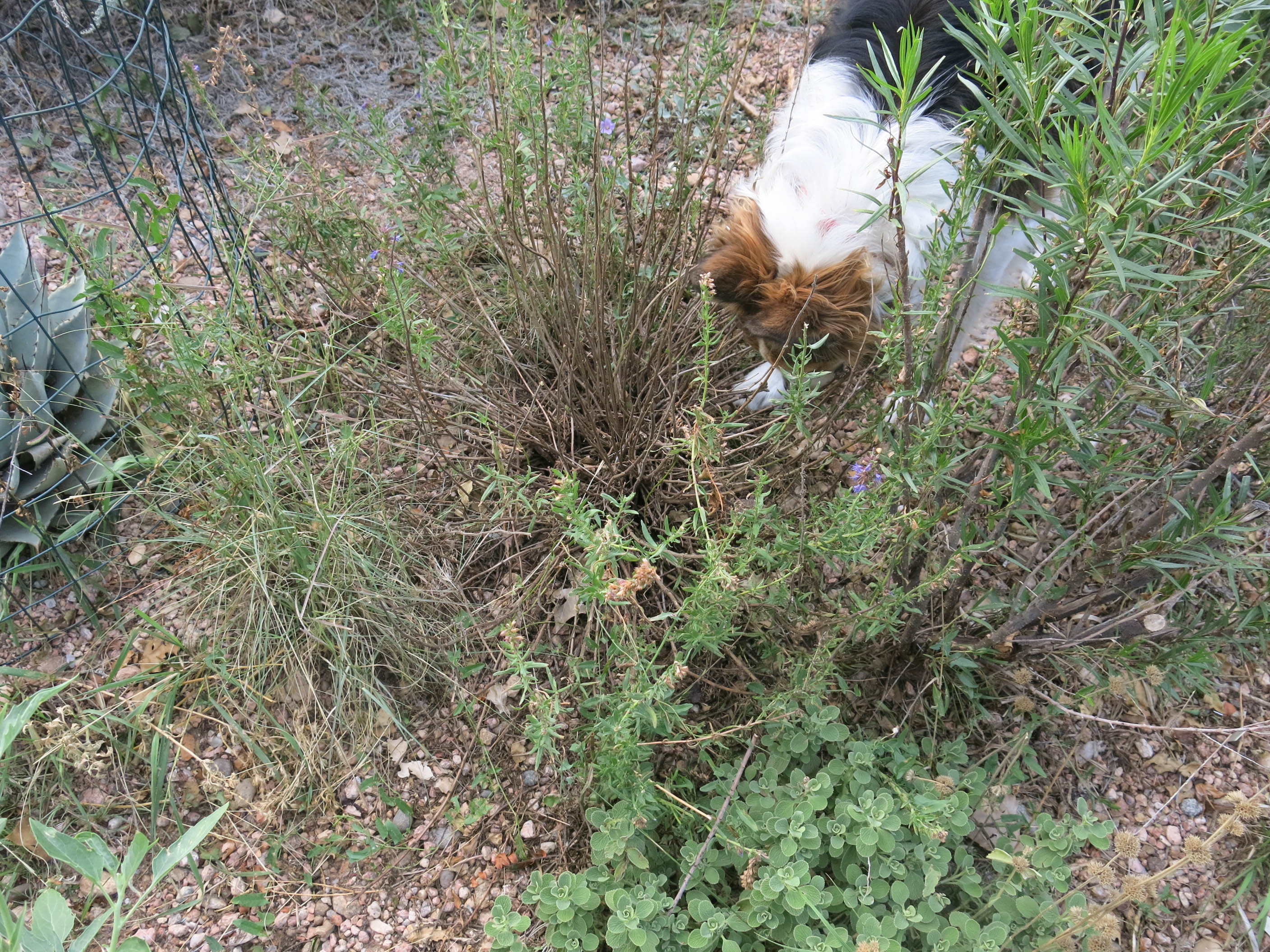 Here I am, hot on the trail of the snake. Maybe you can see the agaves in the fence behind the desert willow I’m looking under. The agaves are fenced to protect me from getting jabbed. I’m not supposed to be in the garden.