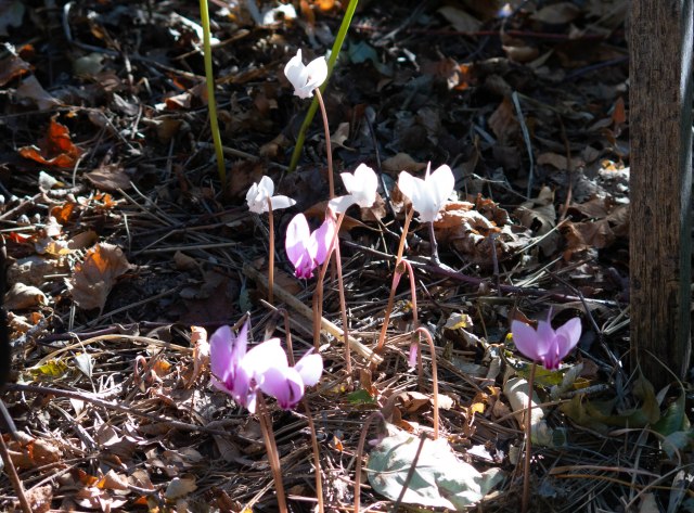 The guy I live with said that a couple of years after he moved into this house there was like a plague of grasshoppers. He would walk through the young garden and grasshoppers would jump on him. He’d be walking around covered with grasshoppers and their juice. Cyclamen purpurascens flowers in summer. The ones in flower now are C. hederifolium. Then there are species for winter and sometimes spring. (March, here.)