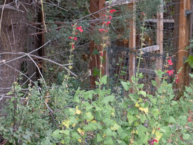 Some watering has been done, but not nearly enough. It rained today; about a hundred drops. Several years ago the guy I live with planted some Salvia darcyi in the front bed, under the upstairs bedroom window, in the only part of the front yard that’s ever watered, and they get watered fairly often (like once every two weeks), because they need water in order to flower. The important thing here isn’t the flowers, really, because the plants become a bit unattractive in the later stage of flowering, but the visitors. Maybe you can see the visitor, here, sitting on one of the wire cages set there to keep rabbits from eating everything.