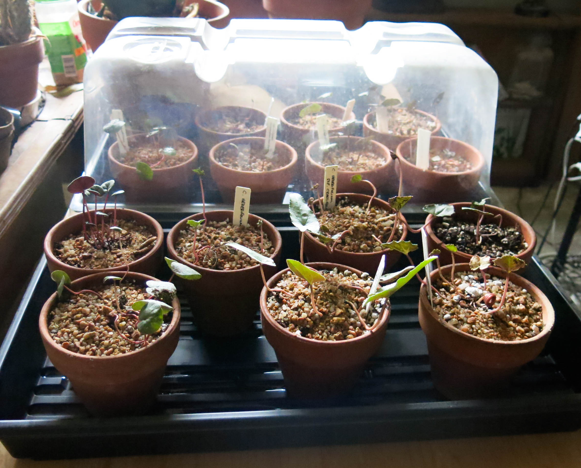 Aside from snowdrops, the new cyclamen are happy in the flats upstairs. The cyclamen are in “nanodomes”, which help prevent them from drying out too much. There are little vents in the tops of the nanodomes, which can be closed, though with the cyclamen the vents are open, so the cyclamen won’t get soggy. You can see that the plants are happy right now.