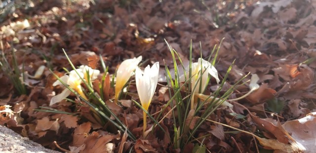 The crocus, Crocus niveus, is still flowering, even though it gets a little below freezing almost every night. This is a special form of it, I guess. There are some others which finished flowering quite some time ago; you can see the leaves off to the left.
