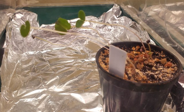 By the way, the seedling cyclamen were grown from pretty old seed, which you can do even though some people say you can’t. The packet of seeds came from the distribution of surplus seeds from the North American Rock Garden Society seed exchange. The seeds get the covering of gravel you see there, then the well-watered pot of seeds goes into a baggie which is folded over (not closed), and then into the closet until the seeds start to germinate. This can take several weeks.