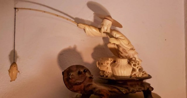 The statue sat on “the Magnavox”, which was a nice cabinet holding a record player and albums of 78s (the guy I live with said he can still remember the pleasant smell of the cabinet when the doors were opened), and the blue lamp you sometimes see in pictures featuring me. A plate of oreos, some celery, and a glass of milk were set out on top of the cabinet on Christmas Eve, for, you know, the visitors. And that’s what the guy I live with thinks of when he looks at the ivory fisherman.