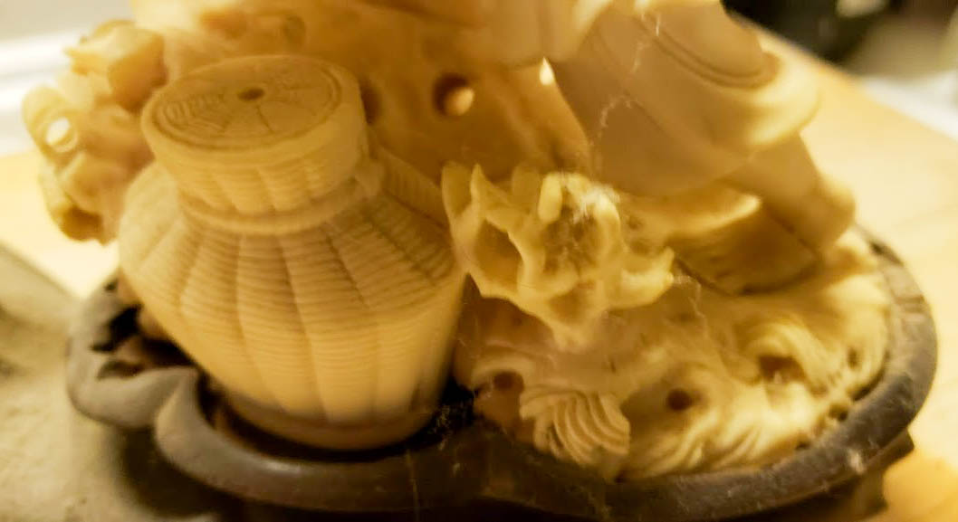 “Ivory?”, you ask. Well, yes. Maybe I never showed a picture of this before. It’s on a little wooden platform on the wall; the guy I live with brought it to the house when he and his wife moved in. It’s very dusty, as you can see. (The guy I live with carefully washes it off about once a year.) These pictures are not hugely in focus.