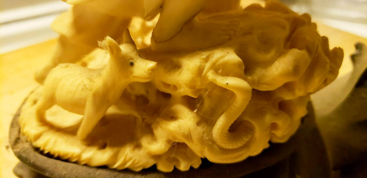The fisherman has always been called “Leo Key” but that might not be right, since “Leo” doesn’t sound especially Chinese. It is ivory, except for the eyes in the dog and snake.