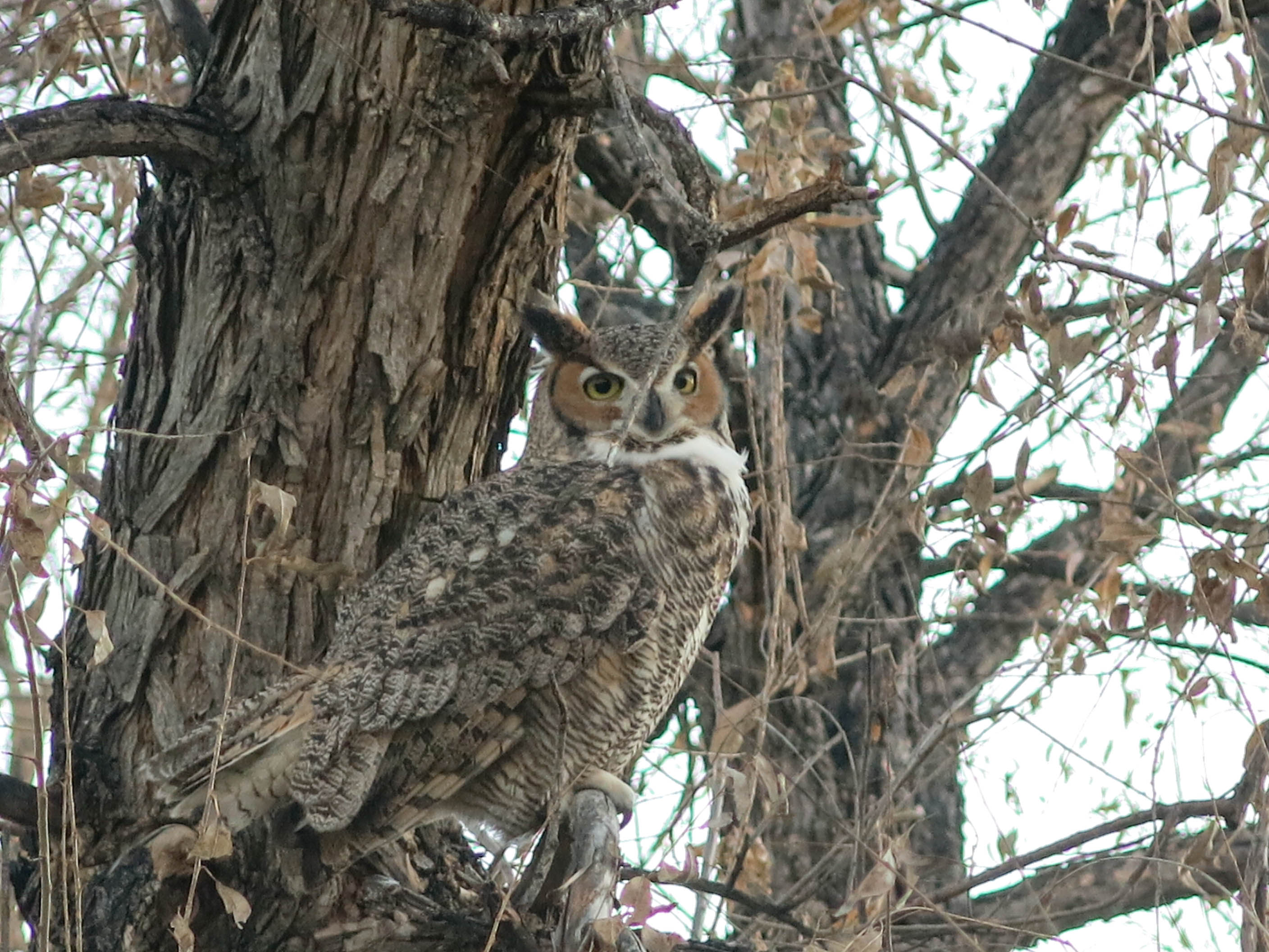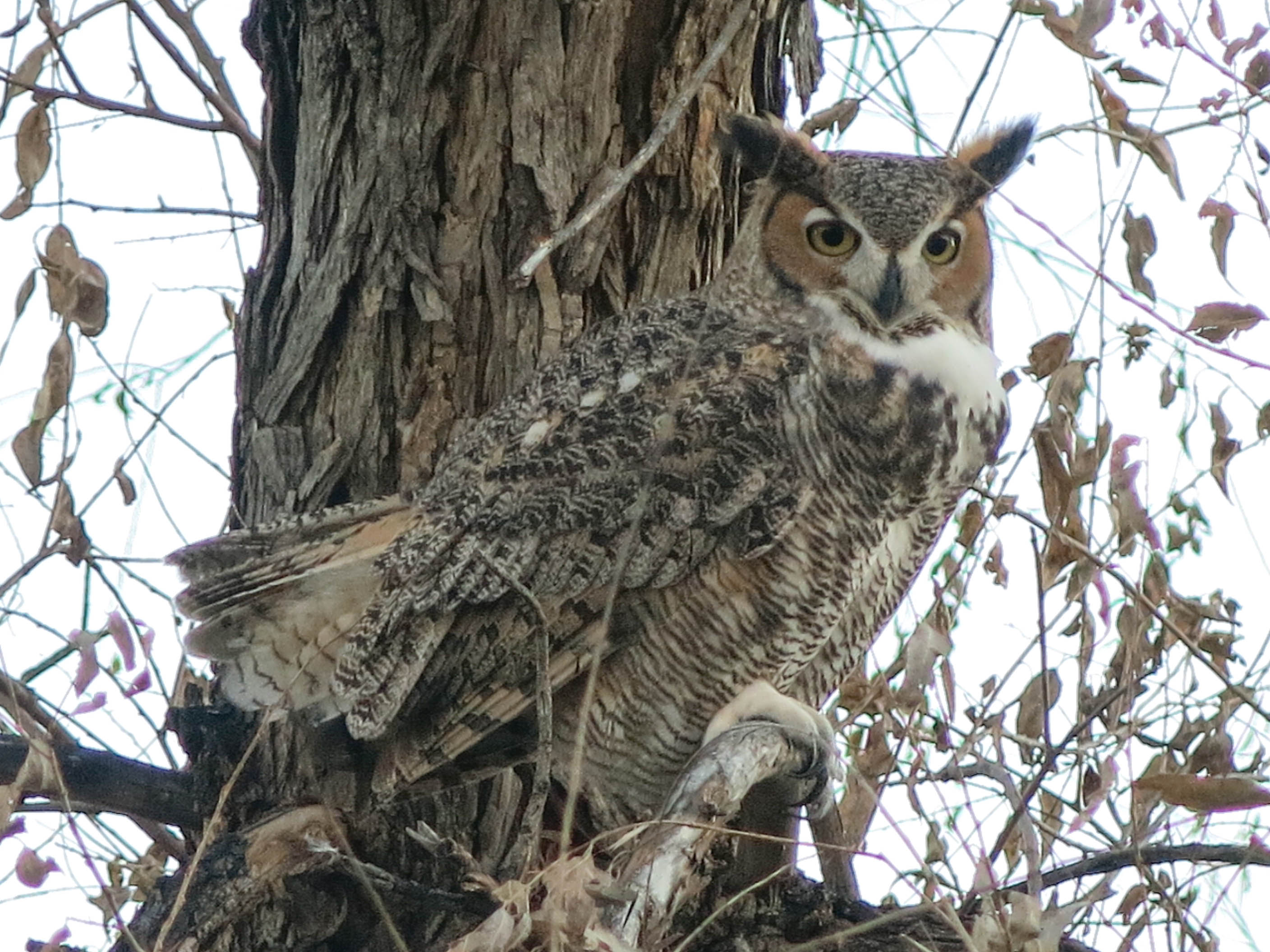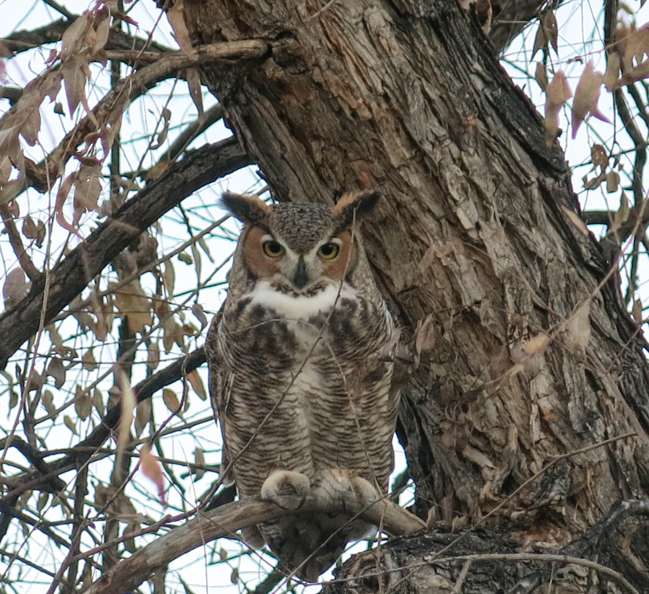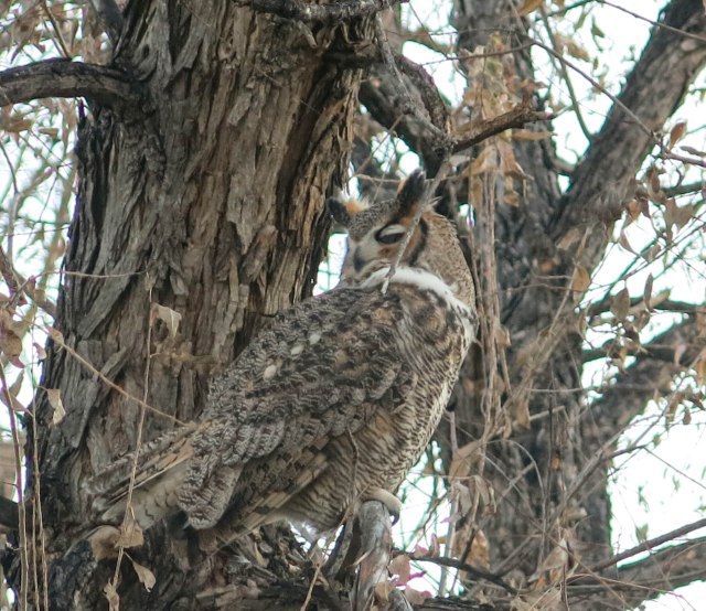 The second owl was hooting when we walked up to it. It was only about twelve feet off the ground, in one of the willows. It kind of leaned forward and went “Hoot hoot”. Then a young woman came by with her two kids, and two dogs that I bark at when they walk by my house and the guy I live with always says I know those dogs. The guy I live with made a kind of Quiet signal and pointed to the owl, so the two kids walked up very quietly, and got to see their very first owl. That was pretty cool.