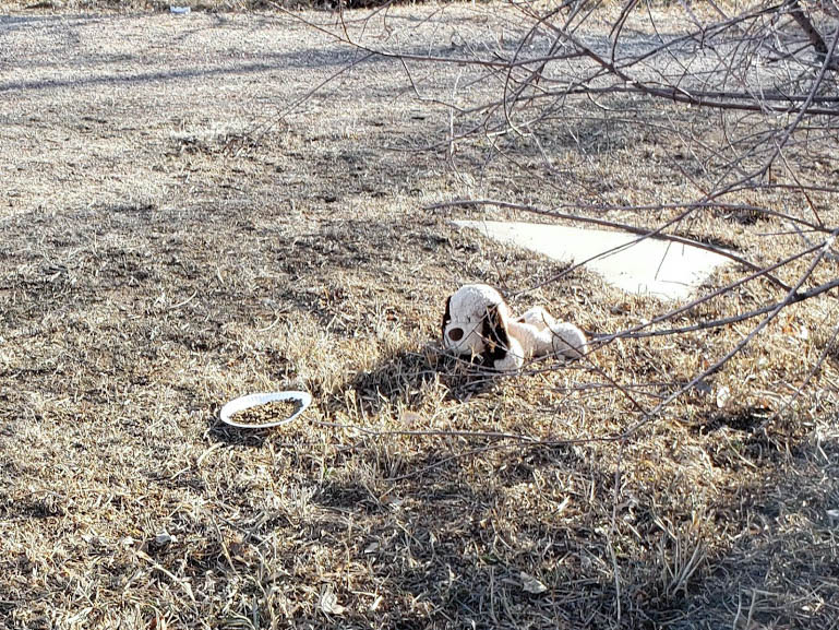 The guy I live with had to look up Pennywise. He hasn’t seen that movie. We both thought the reindeer thing was odd. Now the paper plate is gone and the stuffed dog has been moved. Coyotes, maybe.