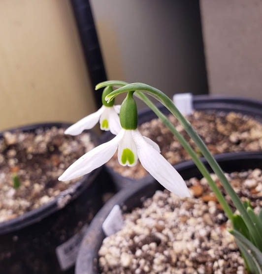 Galanthus elwesii ‘Barnes’, flowering under the lights upstairs.