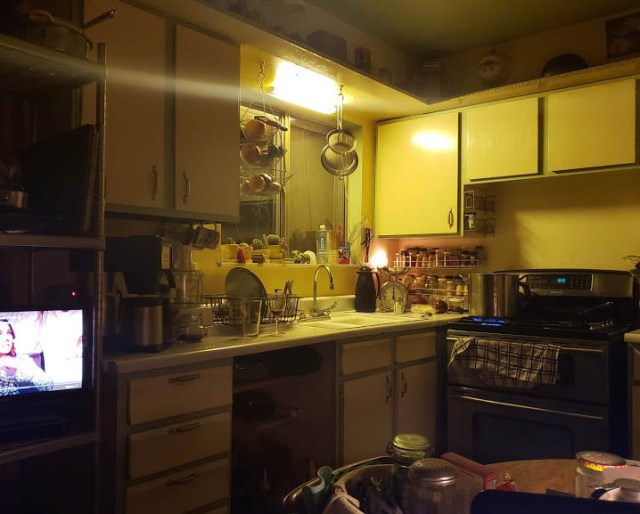 This happened night before last, I think. Last night the guy I live with took a picture of what it’s like to sit at this laptop, even later at night, with Q.I. on the television and a pot of menudo cooking on the stove.