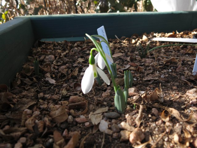 Some snowdrops flowering in the frame. The soil has frozen there, too, but thaws out during the day.