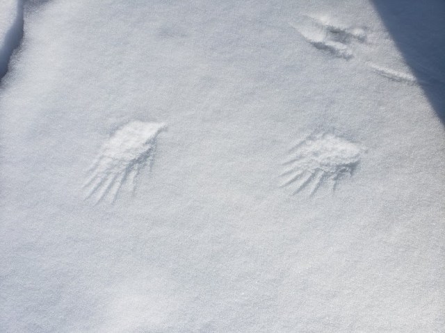 I saw those wing marks in the snow for the first time in Michigan a few winters ago – very beautiful, but I never managed to see a bird actually making one. Doves, maybe?