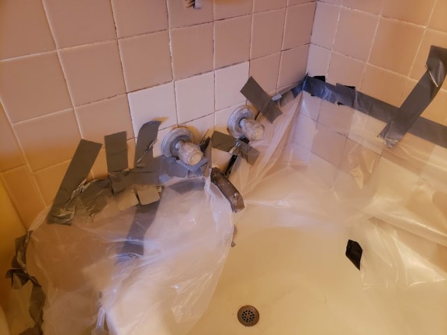 Once the tub had been re-caulked, plastic had to be taped around the tub so he could take a shower. Like me, the guy I live with is obsessed with cleanliness, and likes to bathe every day. This is what the tub looked like after the plastic was taped around the faucet end. I’m sure you’ll be impressed. It’s kind of like an episode of “The Red Green Show”. You can see that the grout around the tiles needs to be cleaned, too.