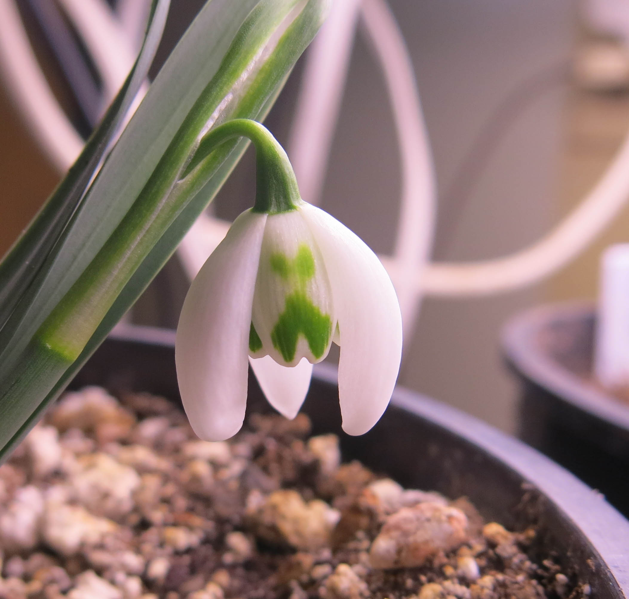 Yes, snowdrops again. There are none flowering in the garden, because of the snow, but there are some flowering upstairs, in what is technically the master bedroom but has never been used as such. It’s just the guy I live with’s room, and has been since he moved into the house with his wife, who had rooms downstairs.