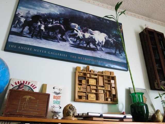 This is what he sees when he wakes up in the morning. A print of a painting by Rosa Bonheur, an ancient mah jongg set, a sort of gamelan, and a display of rubber stamps the guy I live with’s wife made from an old typesetting box.
