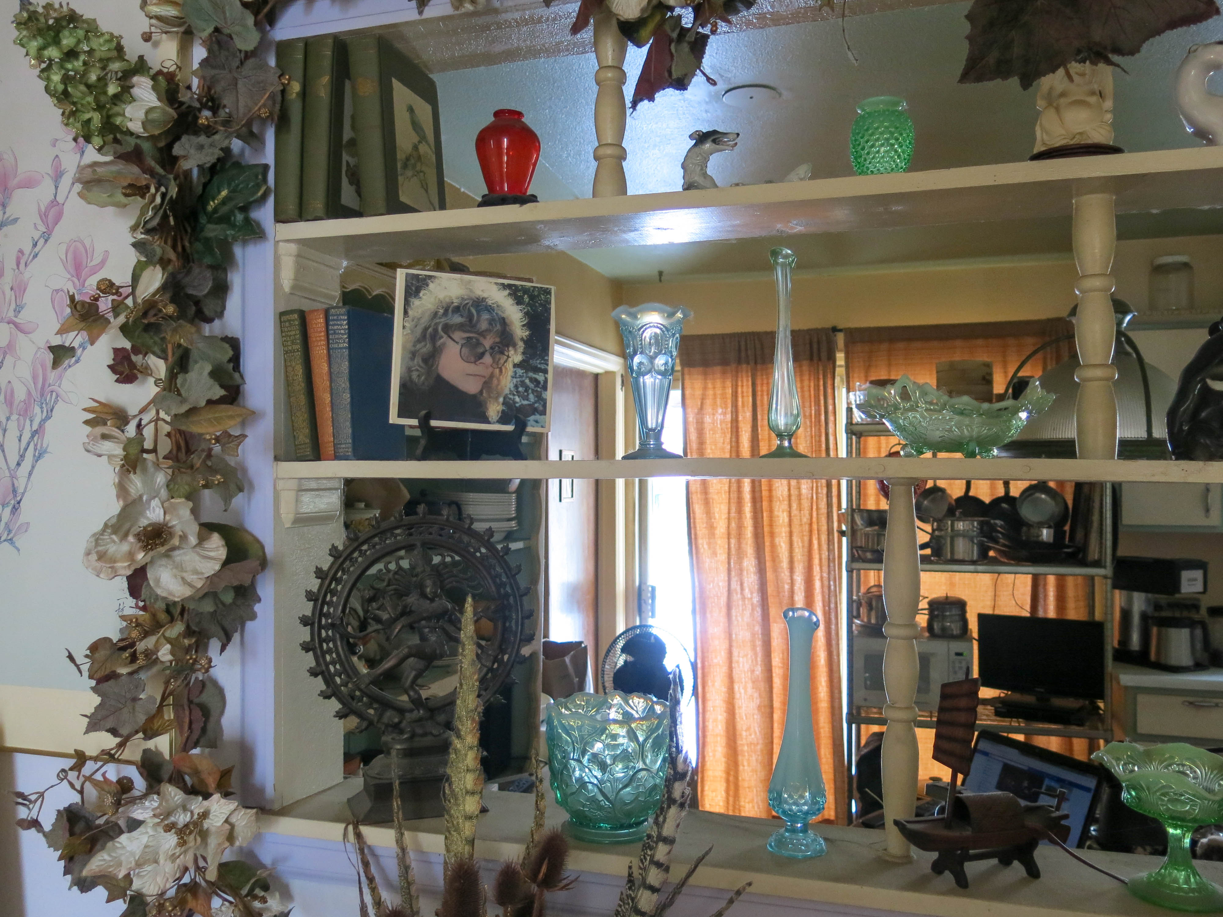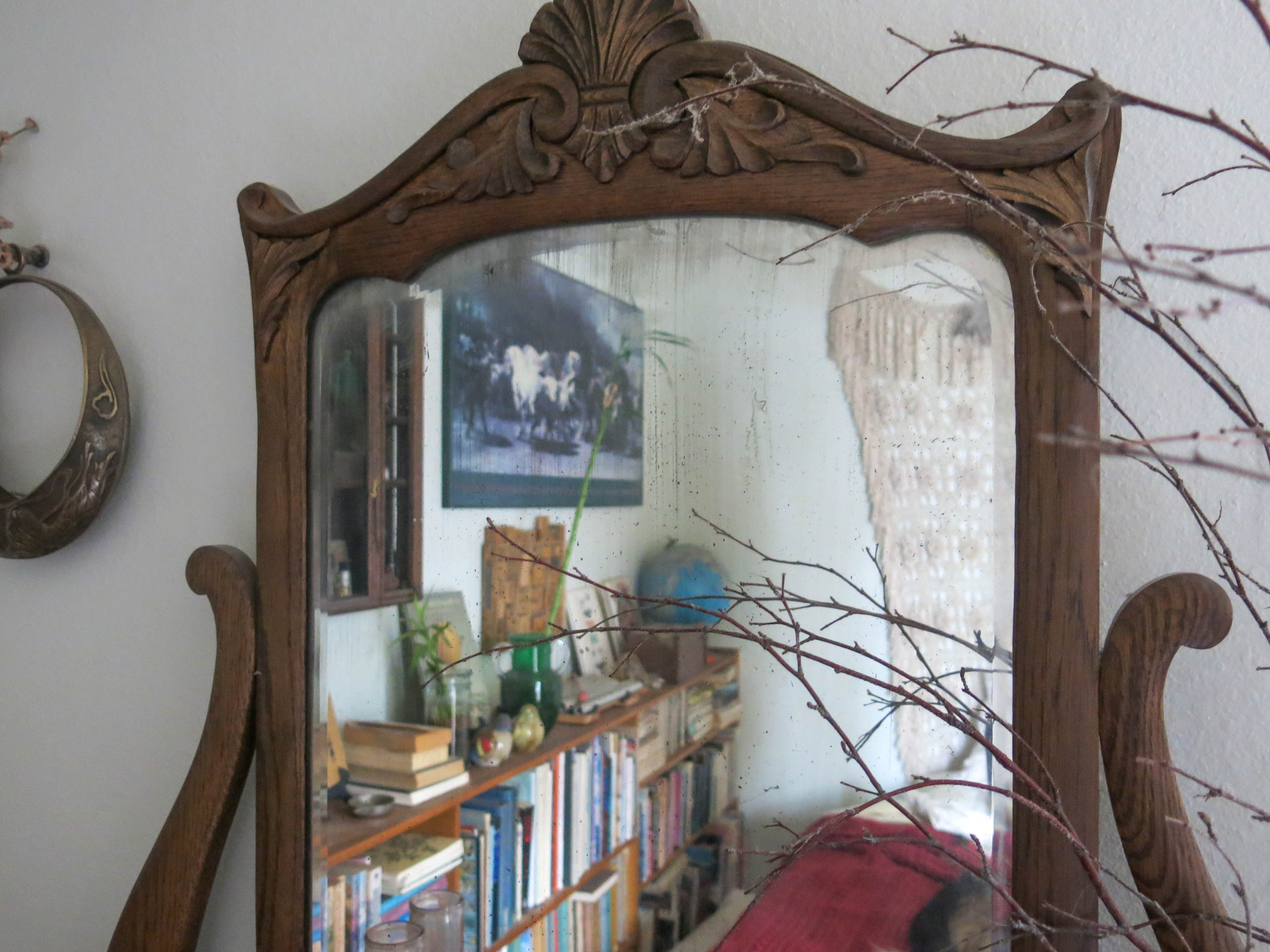 Next to an ancient dresser, which is mostly full of greeting cards. The mirror is a zillion years old, I think.