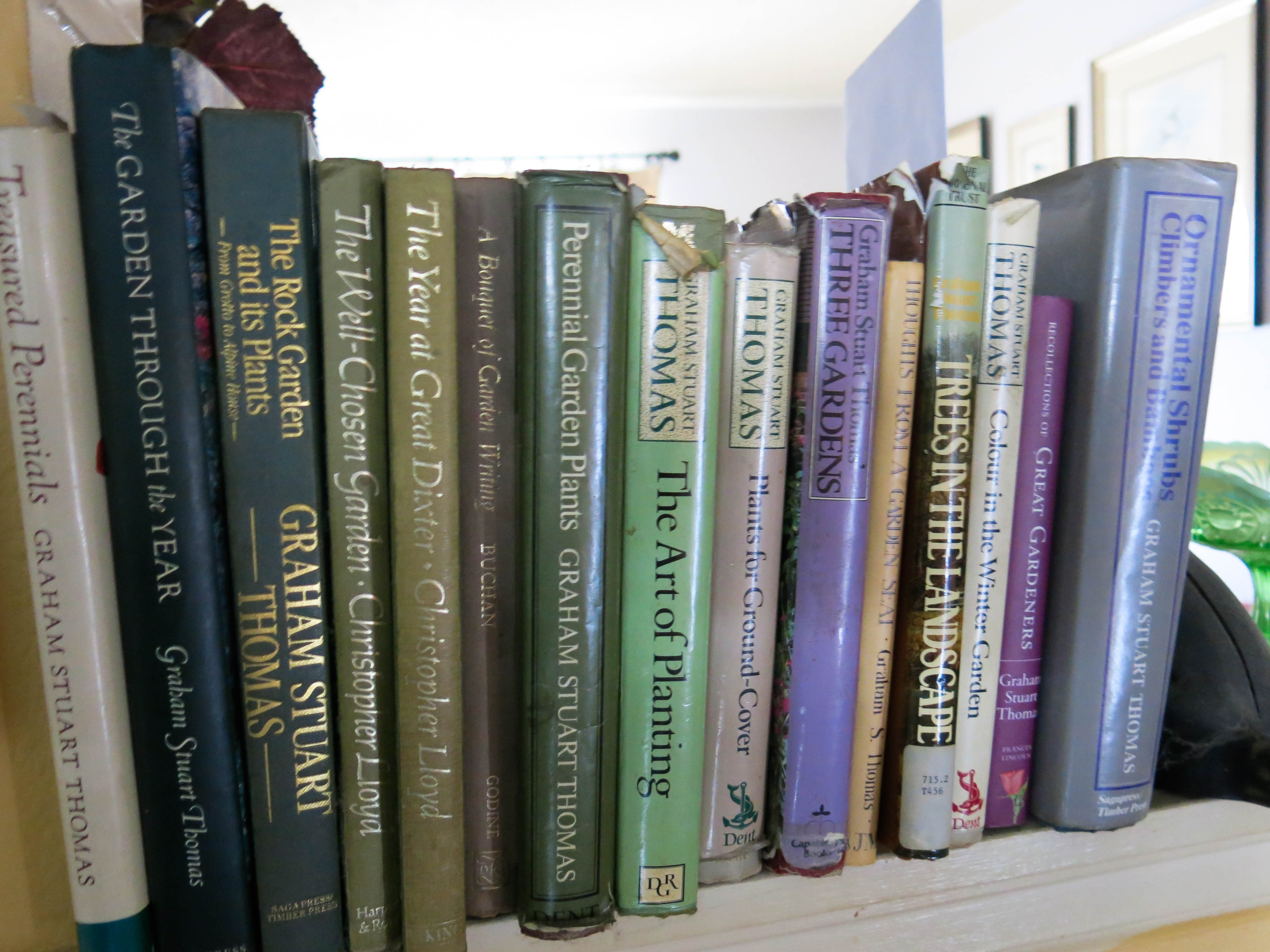 Back upstairs, the rest of the books by Graham Stuart Thomas, and some by Christopher Lloyd, on the partition between the living room and kitchen.
