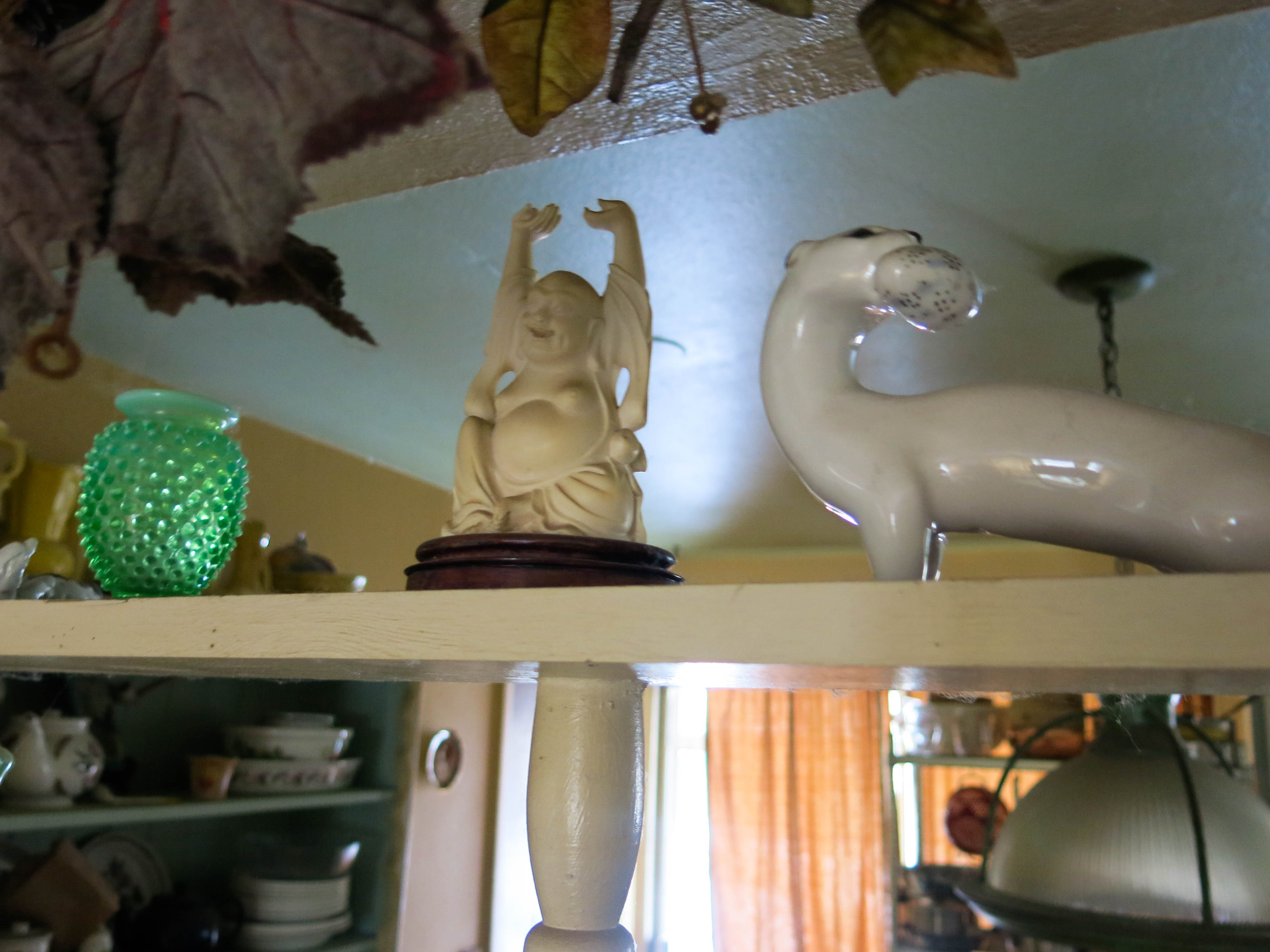 The Buddha, or Hotei, is real ivory, from the old days. The guy I live with’s mom accidentally broke a couple of the fingers. “Condition issues”, like they would say on The Roadshow.