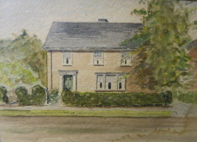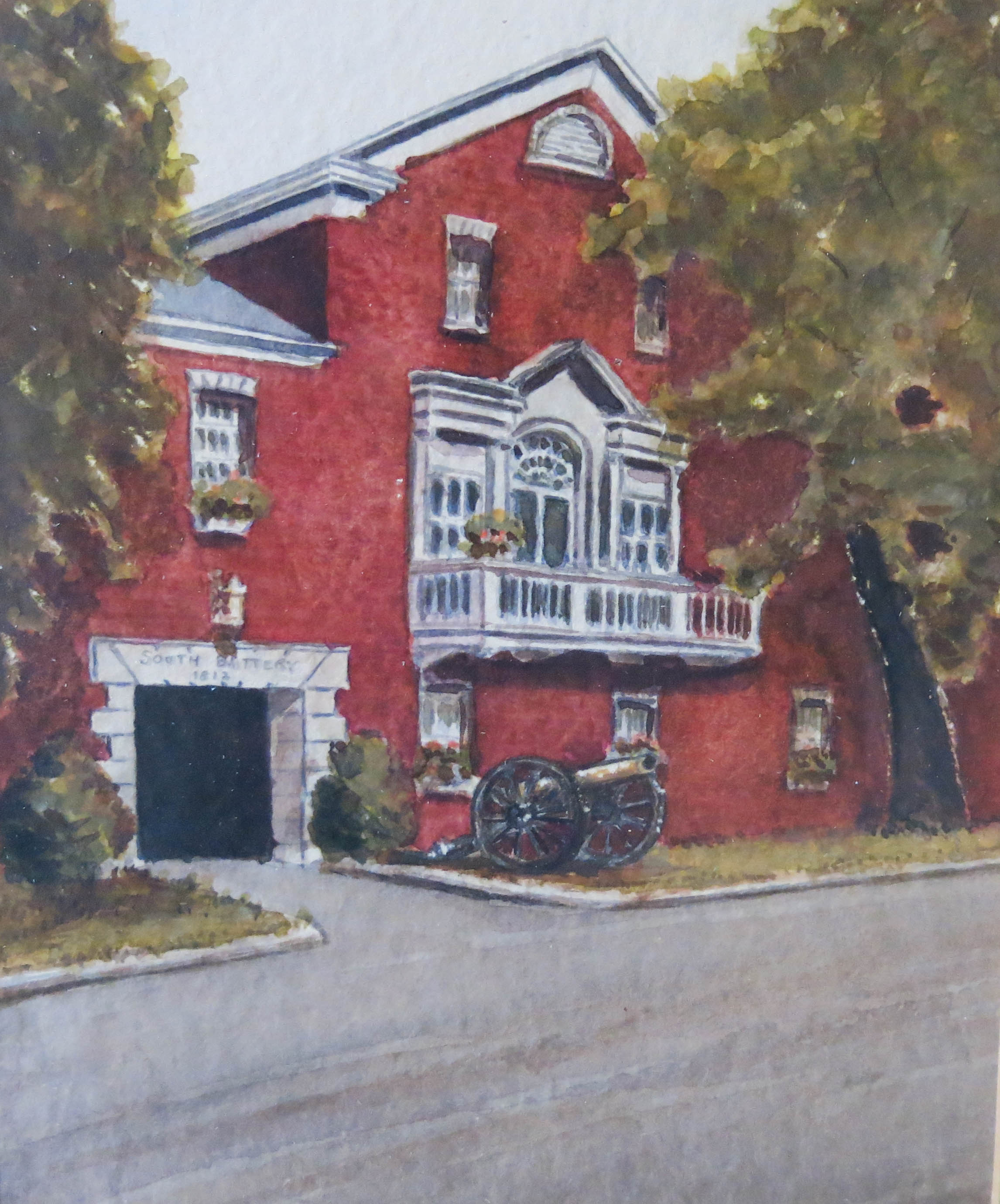 Farther down the stairs are watercolors his grandfather did. He got these from his mom’s house after she died, and likes the paintings there, instead of bare walls. I think this is a fire station, maybe in Newport, Rhode Island, which is where he was from.