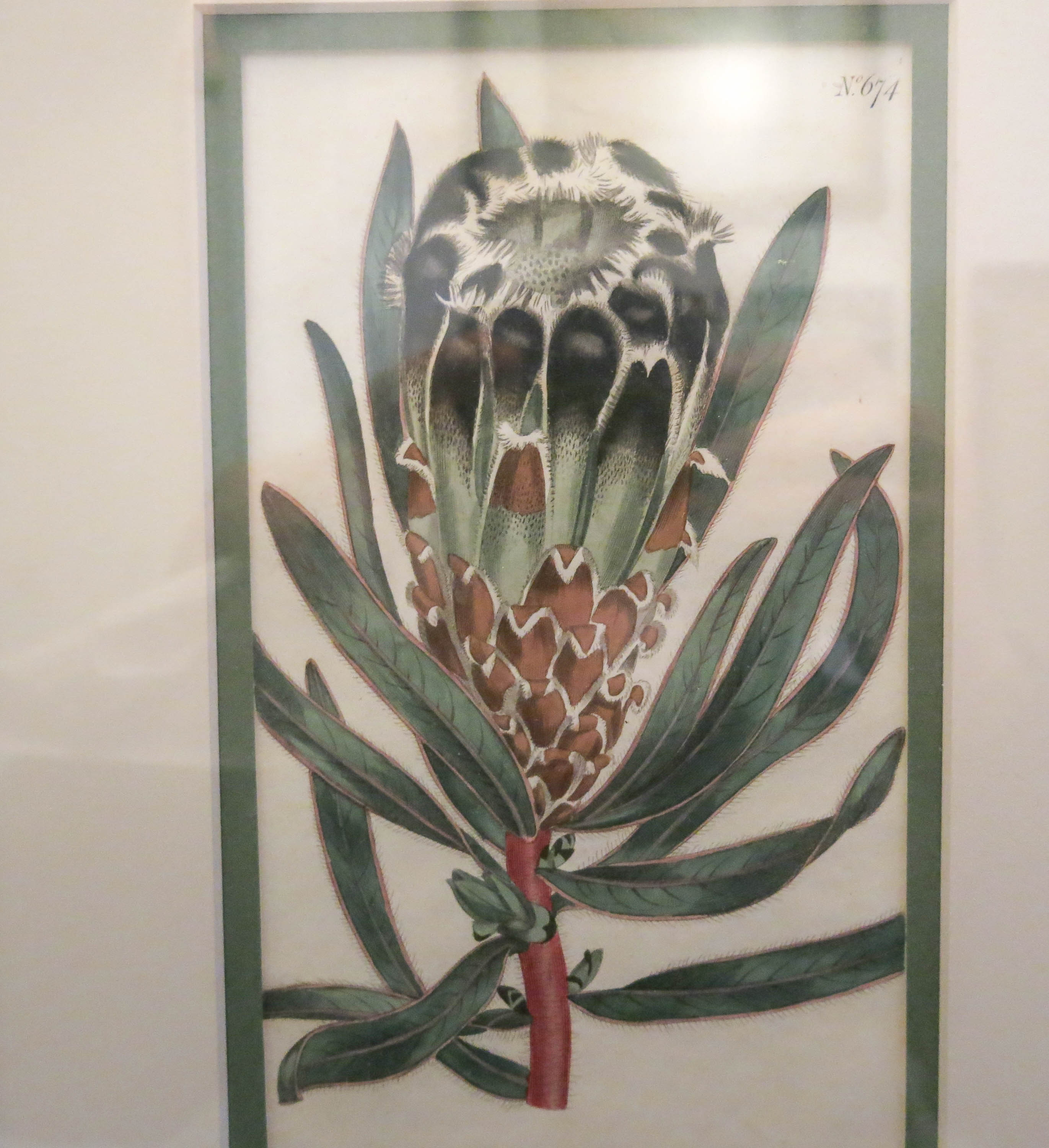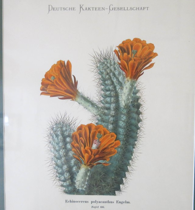 There are some framed pages from a cactus book by Karl Schumann made in 1900 on the stairs.