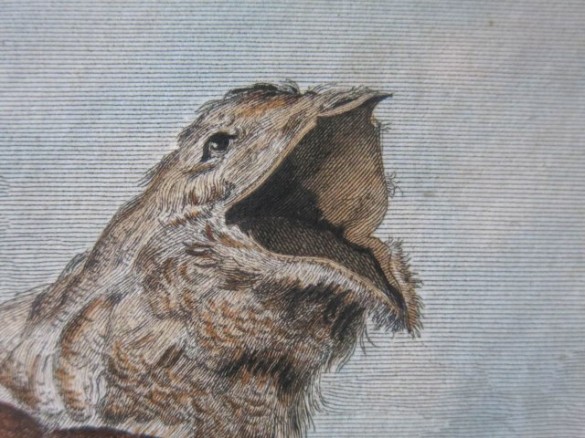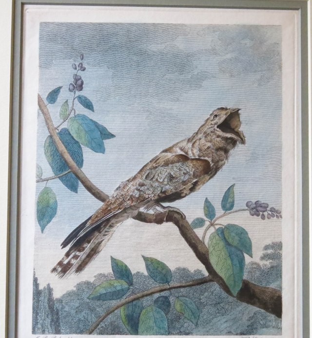 On the other wall, kitty corner from it, is an old hand-colored print of a goatsucker. A page from an old book. The guy I live with bought that after his wife died, and had it framed. That was one way he made it through the first few years without her. Painting the house, and buying engravings, having them framed, and hanging them on the walls. Things like this are surprisingly inexpensive. (I think this was sixty dollars. Cheaper than some snowdrops.)