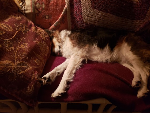 When I lived on a creek the crayfish would come up and nibble your toes. You’d be sitting on a rock daydreaming and become aware of a light touch on your feet. They never pinched and maybe decided we weren’t good eating. Well, Mani that picture of you sleeping with your tongue out is very appealing. I often wonder why it’s so cute when dogs do this or that, but if a human adult did the same thing you would say eeeww. Nice color scheme with the plants. Was it planned? I am wondering if your house sits on an acre. It seems like a big garden and that is a lot to take care of as the years advance. Perhaps you could harness some of that energy and fierceness to help with garden tasks. Sorting tags, for example.