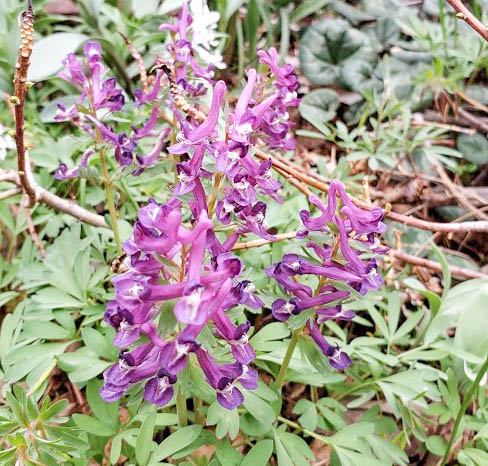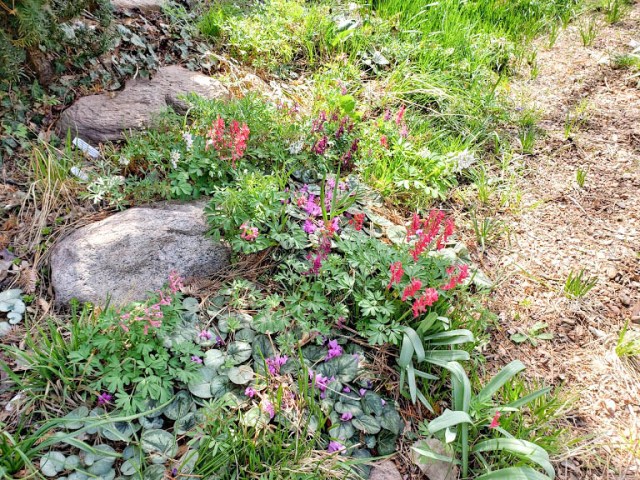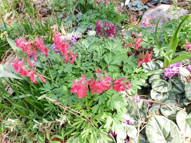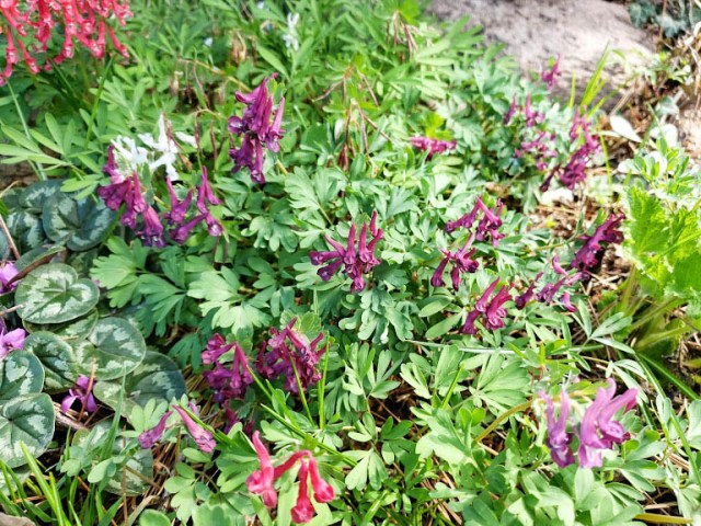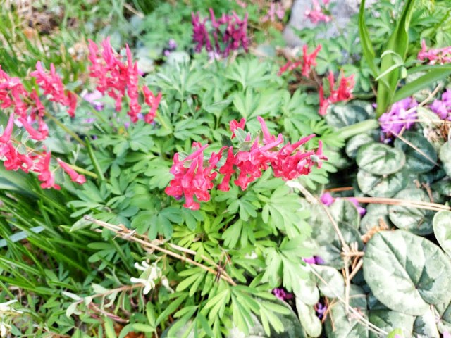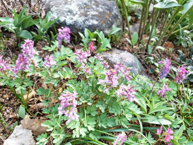 There are bunches of things in flower now. He used the phone to take pictures of these color forms of Corydalis solida. The focus could have been better. He says the corydalis all had labels once, but that a certain puppy stole all the labels because it seemed like a fun thing to do.