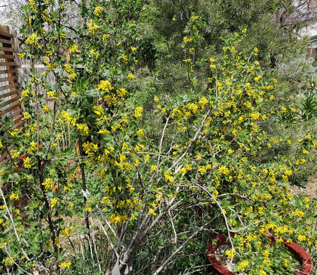Here’s a not-very-good phone picture of the clove currant, Ribes aureum, which is scenting the whole garden right now. It usually flowers in March, I think. There are a lot of these currants in the garden.