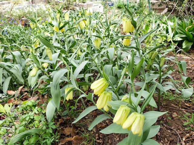 I think the “frits” were grown from J.L. Hudson seed over twenty years ago. You can buy bulbs, but the guy I live with said this was funner. It’s just above freezing right now, and not very pleasant, or so I hear. We purebred border collies prefer cooler weather. There used to be peonies here, but they were given away. We like peonies, of course, but the flowering time is so short. There is a tree peony, Rock’s, which hasn’t flowered in years, because it was transplanted. It was one of the guy I live with’s late wife’s favorite plants.