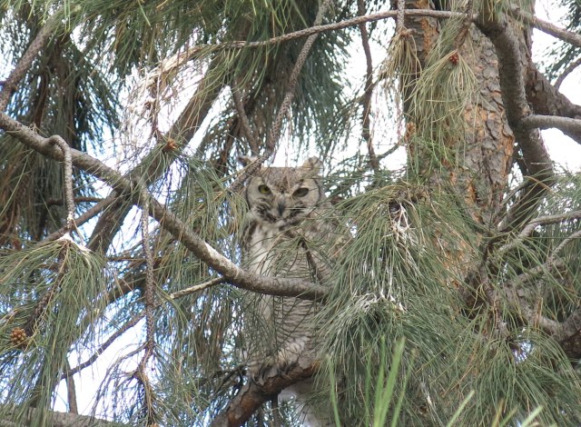My walk this evening was a pretty long one, which I enjoyed, of course. Yesterday the guy I live with noticed that the owls were back, but in a different place. This evening there was only one in the tree. Maybe the other one had to go to the store. The guy I live with is always having to go to the store, too.