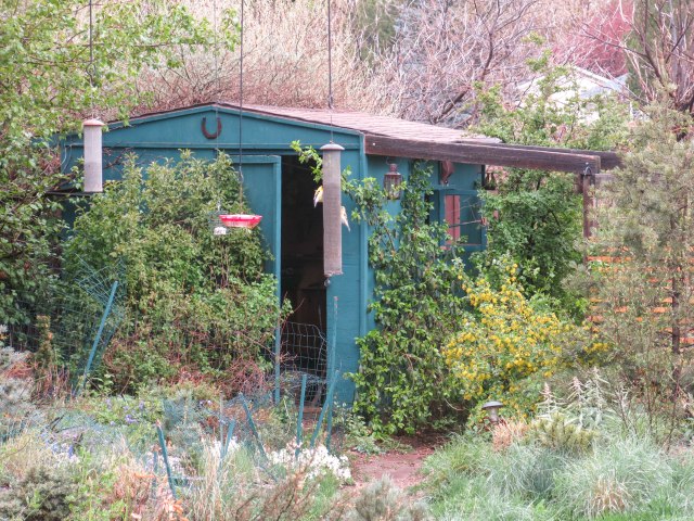 The goldfinches are happy too. I don’t know why the shed always comes out blue in these pictures because it’s green, but the goldfinches kind of go with it.