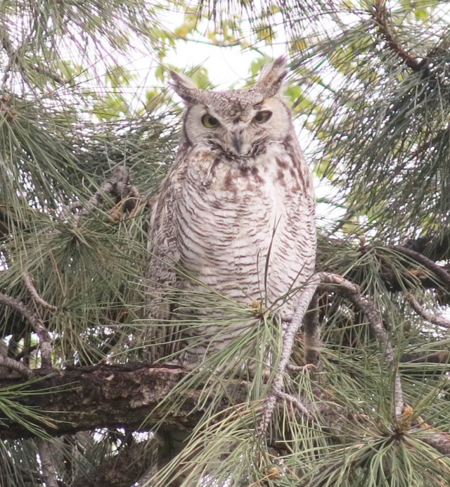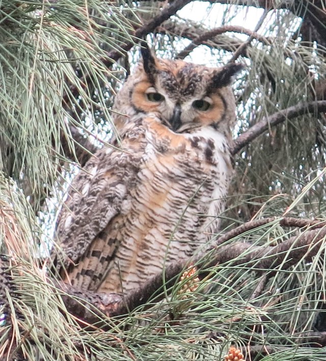 I love the change in the owl’s expression from one image to the next; the second one is distinctly scarier than the first. Still, excellent to know they’re in the immediate neighborhood. Here, we’re very stoked about the bluebirds nesting somewhere in or near the backyard; at the pace they’re food-hunting, it can’t be long now until the chicks fledge. One memorable year a pair here celebrated the success of getting four fledglings off and hunting on their own by taking a long, playful bath in the bird bath (which they hadn’t gone anywhere near in the months since they arrived).