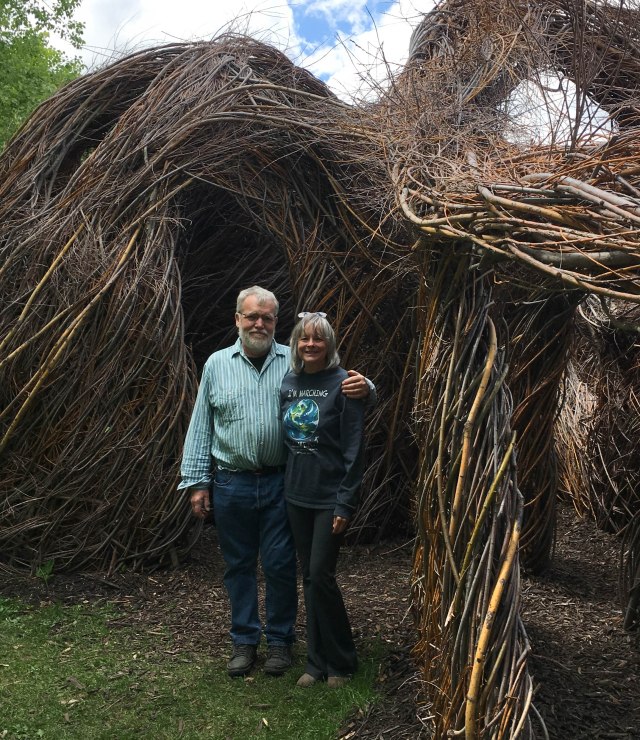 The place is pretty big, several acres, but eventually they found the willow sculpture, and also met someone they knew, who took one of the pictures. Pretty sure you’ll be able to guess which one.