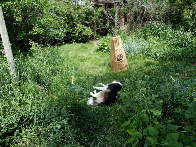 There are a lot of dead branches this year, which is what the bag is for. The smooth brome and other weeds just get piled up in bare spaces in the back garden (the “way back”). I can tell by the language used that the guy I live with does not care for smooth brome. But after the big weeding session it looks a lot less unkempt back there.
