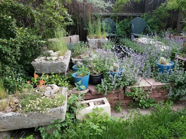 Thanks. There was no weeding here at all today, because I had to stay home, alone, while the guy I live with was gone. He was gone for a long time. I know where he went. He went to see his friend, and they went to this large nursery that’s going out of business. He had this fantasy that he would go there and they would have desert willows for sale, because he thought another one in the back yard would be nice. Unbelievably, there were a few there, and so he came back with one. I agree that the photo of the trough patio would have been improved by being cinderblockless. Maybe next time.