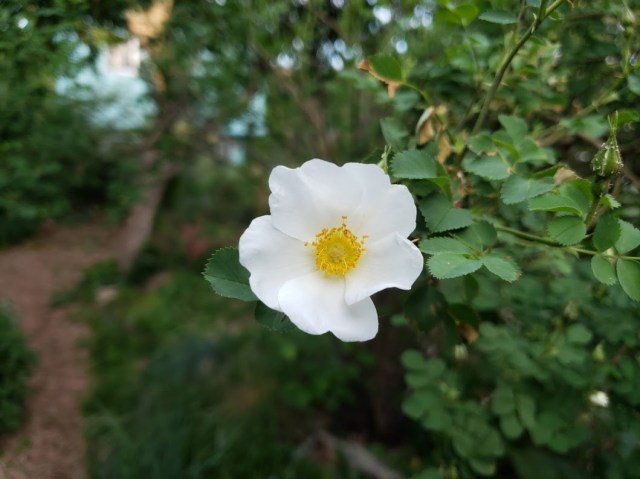 Thank you for showing the photo of Rosa kokanica in all its purity and beauty. I’m not surprised that the guy you live with has that rose in the garden. We just last weekend planted a desert willow, just one, because native plant experts say we can now grow desert plants in our SoCal gardens. We anticipate fragrant nights. Your garden displays well in photos, really, although better perhaps minus a cinder block. My own garden is made more charming, I truly believe, by rambling outbreaks of catmint and feverfew, which both go well with heritage roses, especially kokanica. The guy you live with needs to adjust his vision, is all. I would be delighted to explore your garden, Mani, accompanied by an excellent purebred border collie, tricolor saddleback type