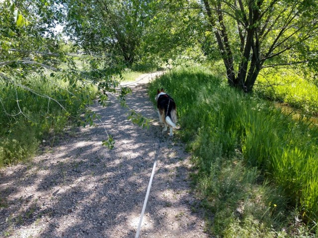 I’m there, in the path. The tricolor purebred border collie.