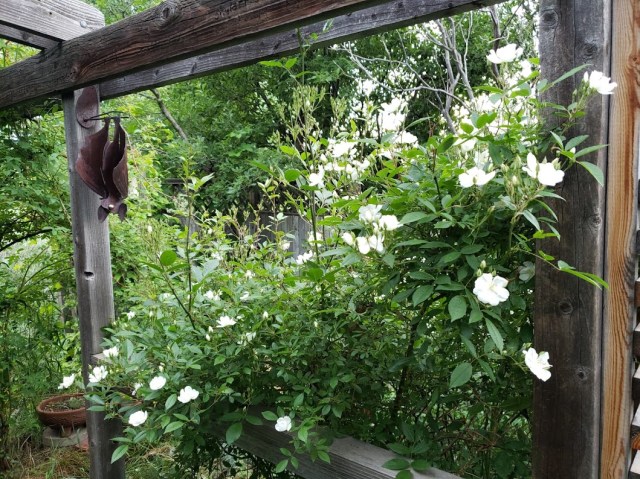 The rose ‘Darlow’s Enigma’ has started to flower. It had a good winter. This picture isn’t very focused at all.