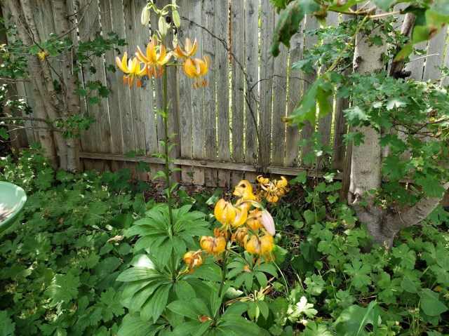 And we have a lily flowering. That’s pretty unusual for here. I mean lots of gardeners here grow them, but they need lots of water which they wouldn’t get here. But there is one lily here. Well, two bulbs. This is Lilium martagon.