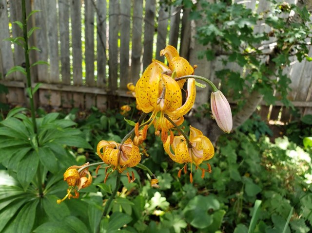 And we have a lily flowering. That’s pretty unusual for here. I mean lots of gardeners here grow them, but they need lots of water which they wouldn’t get here. But there is one lily here. Well, two bulbs. This is Lilium martagon.