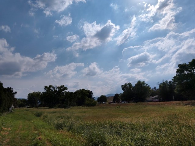 We have tornadoes here, though not often along the Front Range, more out on the plains. Like a hundred miles or more away to the east. The guy I live with saw a tornado once, from several miles away. It damaged a Jack-in-the Box, and the garage where he used to work. The guy I live with says there are places where it just rains. This used to be one of those places. There would be afternoon thunderstorms in the summer, not bringing much rain, but also long periods in spring, summer, or autumn when it would just rain for days. The guy I live with would make a lot of money in overtime. It’s 94F right now, and 14% humidity. The humidity went up (no, really) because it rained a little.