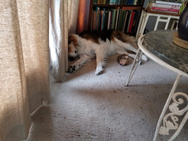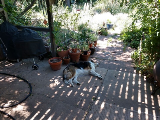 I too tried to figure out the guy you live with’s dog-years age, and then my brain started to hurt. Please tell him congratulations and to celebrate a happy birthday. And he needs some of his very own tadpoles. That is one wicked cactus, Mani, and you are right to avoid. I love the ghostlike appearance of the garden’s artemesia when the camera goes all DSLR aperture priority. Resting in the heat, Mani, you appear as near to boneless as a purebred border collie can appear, I think. I further think all dogs look adorbs when sleeping, and especially you. You have a gift.