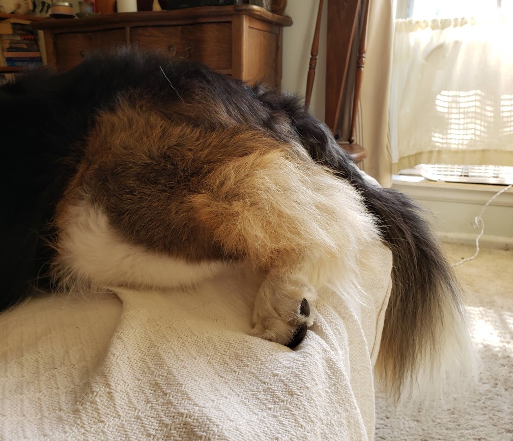The big news for me is that I went to the spa and got totally brushed, and all my mats were cut out. I got a bath. It made me feel pretty good. I’m going to show the picture of my hindquarters that the guy I live with posted on Facebook. I was okay with him showing a picture of my butt on social media. If he posted a picture of his that would be different.