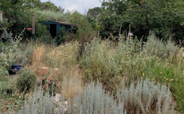 Most of the garden looks pretty frazzled right now. It did rain, the day before yesterday, about half an inch, and some of that soaked into the ground. Not into the parts of the garden that are clay soil, though. The gravel garden is looking better than any other part of the garden because all the water soaked in. Maybe you can’t see that.