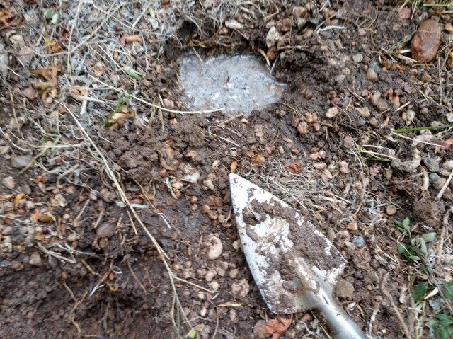 He had to use his “perennial spade”, or whatever it’s called, dig a hole, fill it with water, and then when the water drained away, or, really, got absorbed by the surrounding soil, he dug some more. Rain doesn’t percolate into clay soil the way it does into gravel or sand. It has to rain a lot for that to happen, and it doesn’t rain a lot here.
