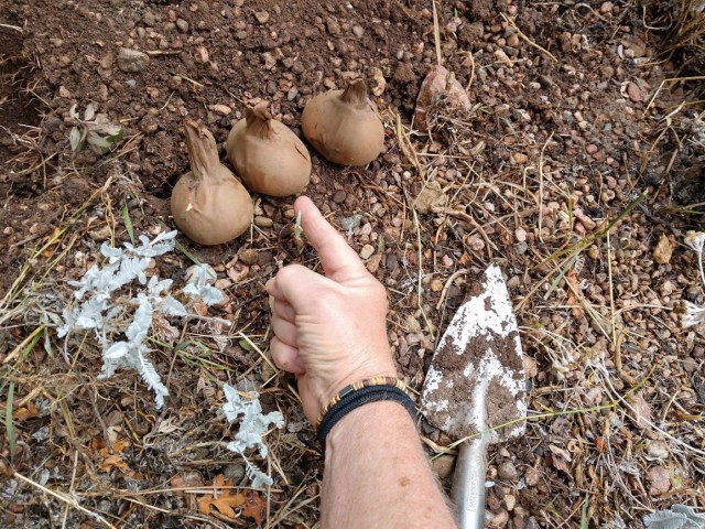 The guy I live with got some colchicums in the mail yesterday, and tried to dig holes. He was out of practice working in the garden, since he hasn’t done much for a couple of months, and thought that since it had rained, digging might be easy.