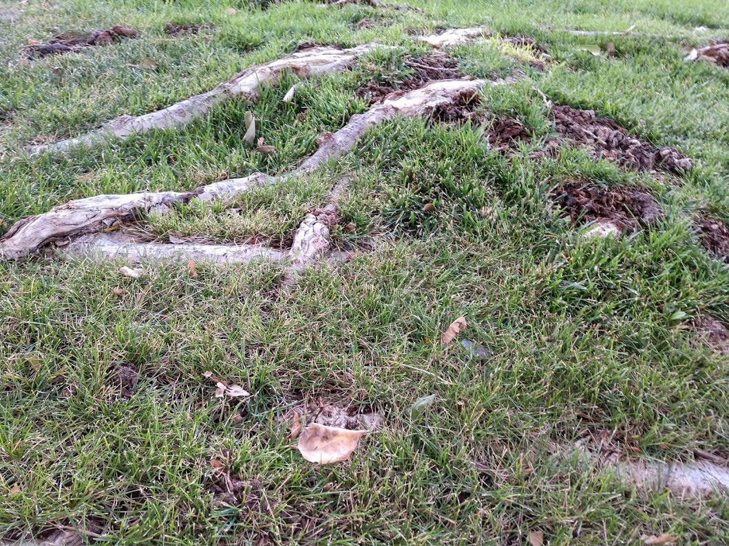 There’s a place where a bunch of cottonowood roots have come to the surface, like huge earthworms, because I guess the grass is watered a lot.
